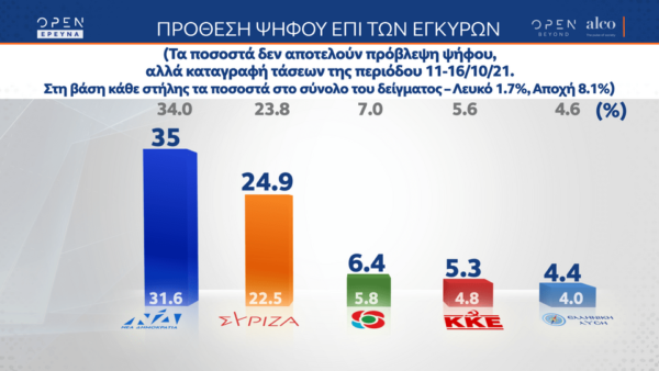 Ειδικότερα, στην πρόθεση ψήφου η Νέα Δημοκρατία αποσπά το 35% και ο ΣΥΡΙΖΑ το 24.9%.