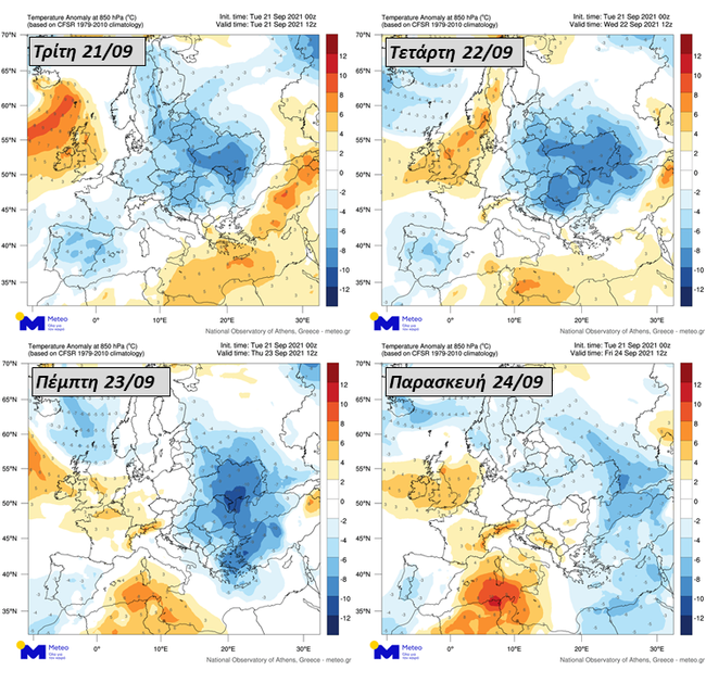 Οι ψυχρές αέριες μάζες που βρίσκονται στην Κεντρική Ευρώπη (μπλε αποχρώσεις) την Τετάρτη 22/09 θα κινηθούν νοτιότερα και θα επηρεάσουν τα κεντρικά και βόρεια τμήματα (χάρτης πάνω δεξιά), ενώ την Πέμπτη 23/09 το μεγαλύτερο τμήμα της χώρας μας θα βρίσκεται υπό την επίδραση των ψυχρών αέριων μαζών, με αποτέλεσμα τη σημαντική πτώση της θερμοκρασίας, όπου θα κυμαίνεται έως και 9 βαθμούς κάτω από τα φυσιολογικά για την εποχή επίπεδα (χάρτης κάτω αριστερά).