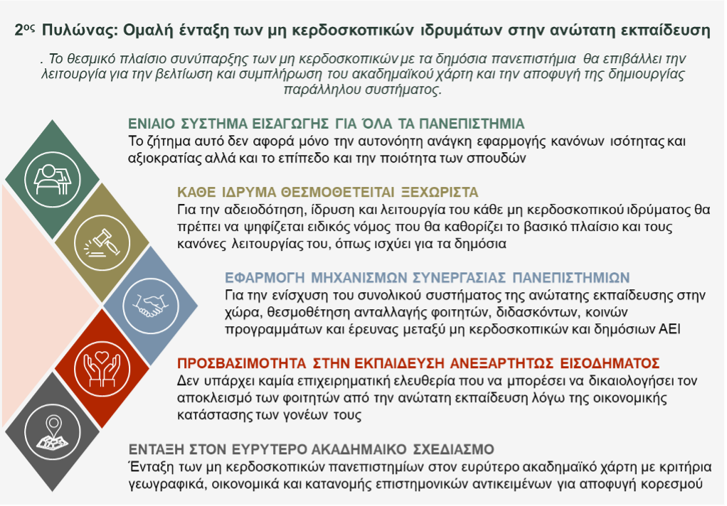 Ομαλή ένταξη των μη κερδοσκοπικών ιδρυμάτων στην ανώτατη εκπαίδευση, με κοινό σύστημα εισαγωγής, ενίσχυση της αποκέντρωσης και αποφυγή κορεσμού αντικειμένων σπουδών.