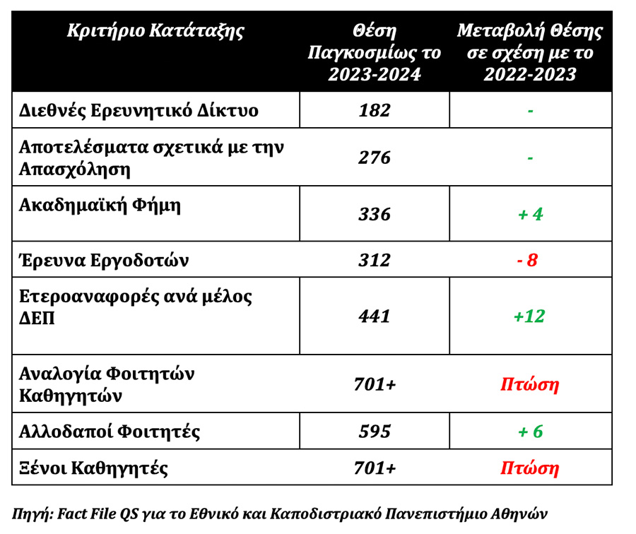 Είναι ιδιαίτερα σημαντικό ότι το Εθνικό και Καποδιστριακό Πανεπιστήμιο Αθηνών βρίσκεται πολύ πιο πάνω από τον παγκόσμιο μέσο όρο στις ετεροαναφορές ανά μέλος ΔΕΠ, στη διεθνή ερευνητική δικτύωση και πάνω από τον παγκόσμιο μέσο όρο στην απασχολησιμότητα των αποφοίτων (δείτε Πίνακα 3). Το γεγονός ότι βρίσκεται κάτω από το 50% του παγκόσμιου μέσου όρου στους άλλους δείκτες οφείλεται αφενός στη μείωση του ακαδημαϊκού προσωπικού ελέω κρίσης και στο γεγονός ότι δεν μπορεί να προσελκύσει το Ελληνικό Πανεπιστήμιο ξένους καθηγητές διότι δεν μπορεί να προσφέρει τα κίνητρα, τις απολαβές και τις εργασιακές συνθήκες των ξένων μεγάλων Πανεπιστημίων.