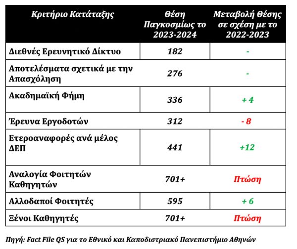 Η επετειακή ανακοίνωση της  Παγκόσμιας  Κατάταξης Πανεπιστημίων της QS (Quacquarelli Symonds), η οποία κλείνει 20 χρόνια αδιάλειπτης παρουσίας στα Rankings, επιφύλασσε μία σημαντική διάκριση για το Εθνικό και Καποδιστριακό Πανεπιστήμιο Αθηνών:  Το Πανεπιστήμιο μας «ανέβηκε» μέσα σε ένα έτος 206 θέσεις, και βρίσκεται πλέον στην 444η θέση παγκοσμίως για την περίοδο 2023-2024, έναντι των θέσεων 601-650 στις οποίες βρισκόταν την περίοδο 2022-2023. Η  εντυπωσιακή αυτή άνοδος οδηγεί στην καλύτερη θέση που είχε ποτέ το ΕΚΠΑ στην κατάταξη αυτή.
