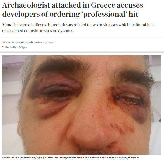Ας τα πάρουμε με τη σειρά. Οπως έγινε γνωστό στις 10 Μαρτίου από τις ανακοινώσεις του υπουργείου Πολιτισμού και του Συλλόγου Ελλήνων Αρχαιολόγων, ο υπάλληλος της Εφορείας Αρχαιοτήτων Κυκλάδων, Μανώλης Ψαρρός, δέχθηκε μαφιόζικο χτύπημα το οποίο -σύμφωνα με όλες τις ενδείξεις- σχετιζόταν με την άσκηση των υπηρεσιακών καθηκόντων του.