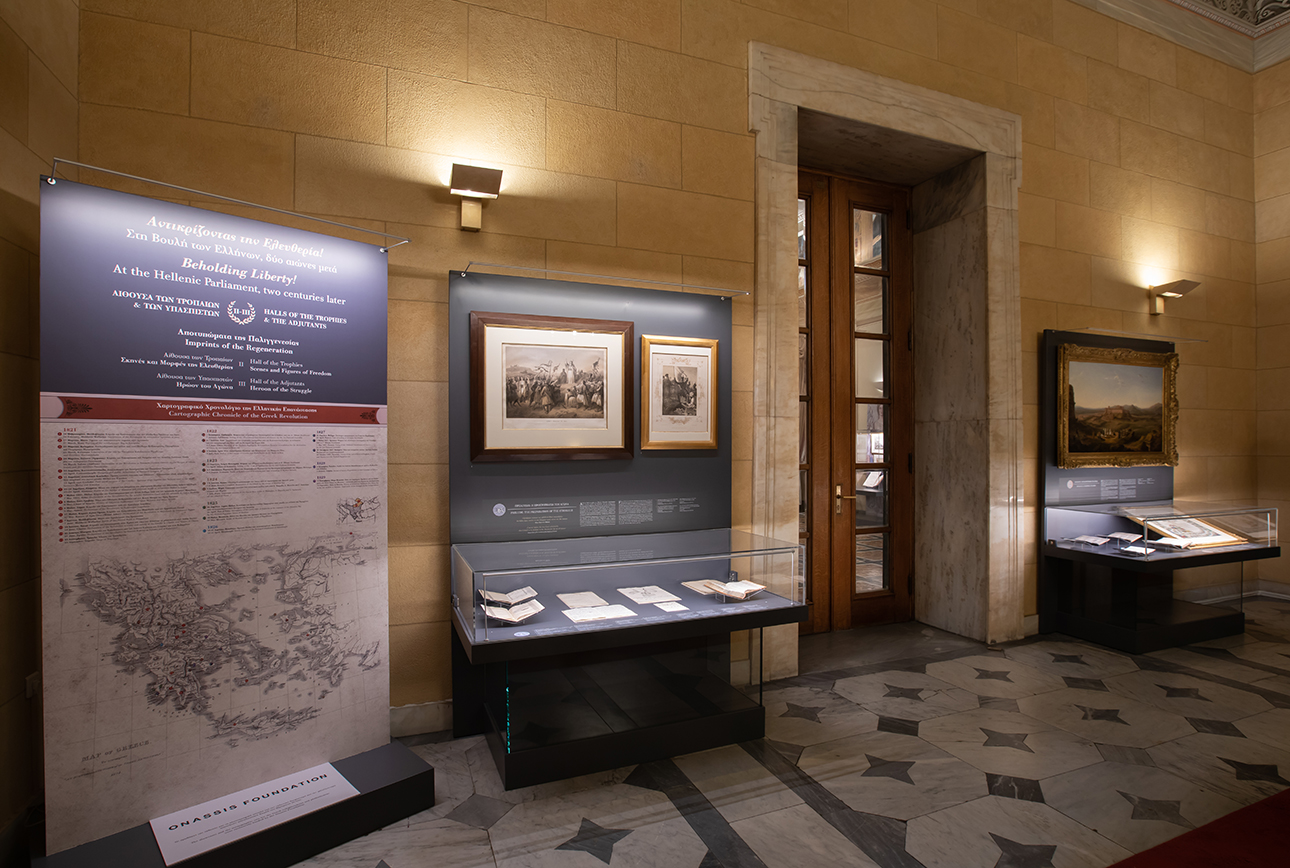 Κατά δεύτερον, η έκθεση διαθέτει ένα ισχυρό αβαντάζ που δεν μπορεί να έχει καμία άλλη. Το κύριο «σώμα» της παρακολουθεί τα αποτυπώματα της Επανάστασης σε μια αίθουσα ιστορική, την πλέον ιστορική του Μεγάρου της Βουλής: την αίθουσα Τροπαίων και Υπασπιστών, ή άλλως Ελευθερίου Βενιζέλου, στον πρώτο όροφο του κτιρίου. Η κατασκευή του χώρου χρονολογείται πολύ κοντά σε κομβικά γεγονότα του Αγώνα (1842-43), δίνοντας στον επισκέπτη την αίσθηση εκείνου του χωροχρόνου – αίσθηση που εντέχνως έχει ενταθεί, καθώς έχουν σφραγισθεί τα παράθυρα προς τη λεωφόρο και η οπτική επαφή με την αθηναϊκή ζωή «έξω» δεν είναι δυνατή.