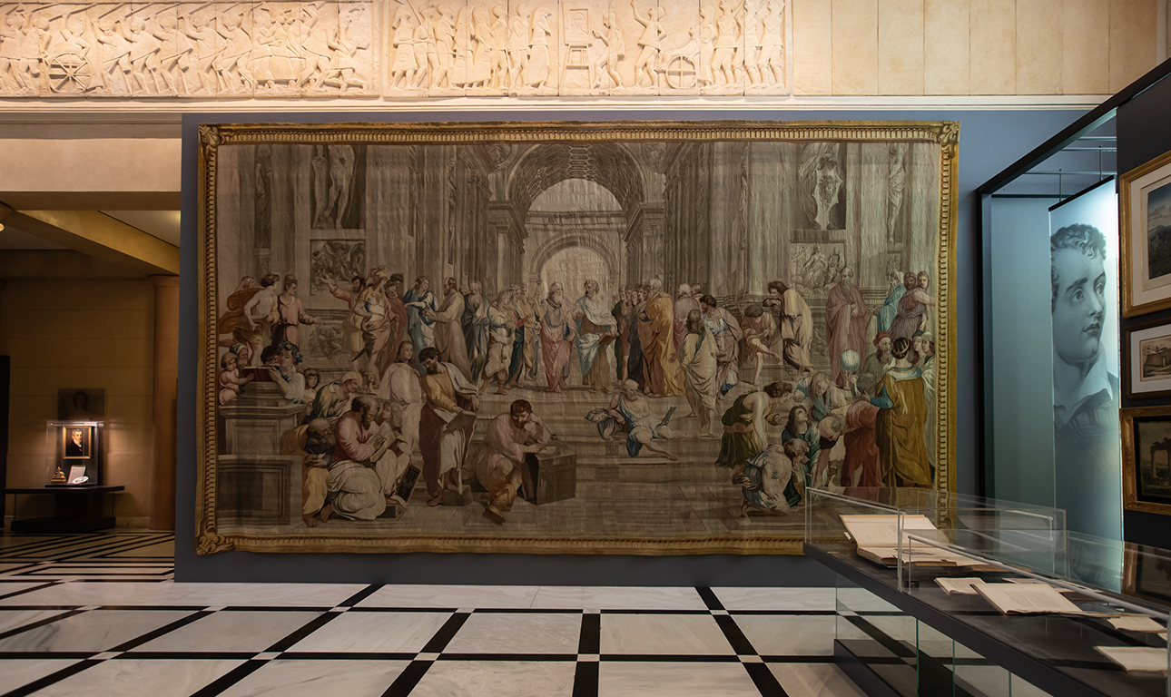 Η αλήθεια είναι ότι η έκθεση δεν αρχίζει και δεν τελειώνει στον πρώτο όροφο, διαθέτει «πρελούδιο», ενότητα-προπομπό στο ισόγειο του Μεγάρου. Εξίσου σημαντικό και ενδιαφέρον. Στο Περιστύλιο της Βουλής, απέναντι από την αίθουσα της Ολομέλειας, τις εντυπώσεις κλέβει η ταπισερί με τη Σχολή των Αθηνών, δάνειο του Προέδρου της Γαλλικής Εθνοσυνέλευσης προς το ελληνικό Κοινοβούλιο, αλλά και η Χάρτα του Ρήγα Βελεστινλή, ιστορικό κειμήλιο – η Βιβλιοθήκη της Βουλής άνοιξε το «θησαυροφυλάκιό» της.