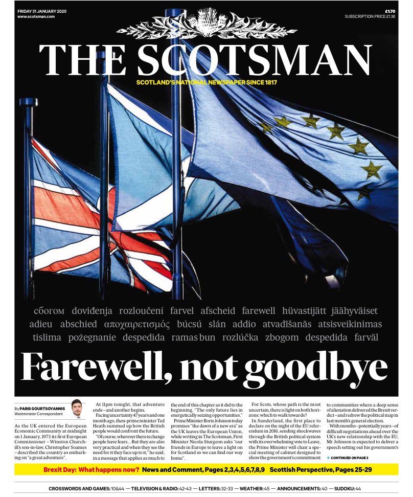 Η εφημερίδα του Εδιμβούργου Scotsman έχει τίτλο: «Εις το επανιδείν, όχι αντίο», ενώ ανέφερε τη λέξη «αντίο» σε 24 ευρωπαϊκές γλώσσες.