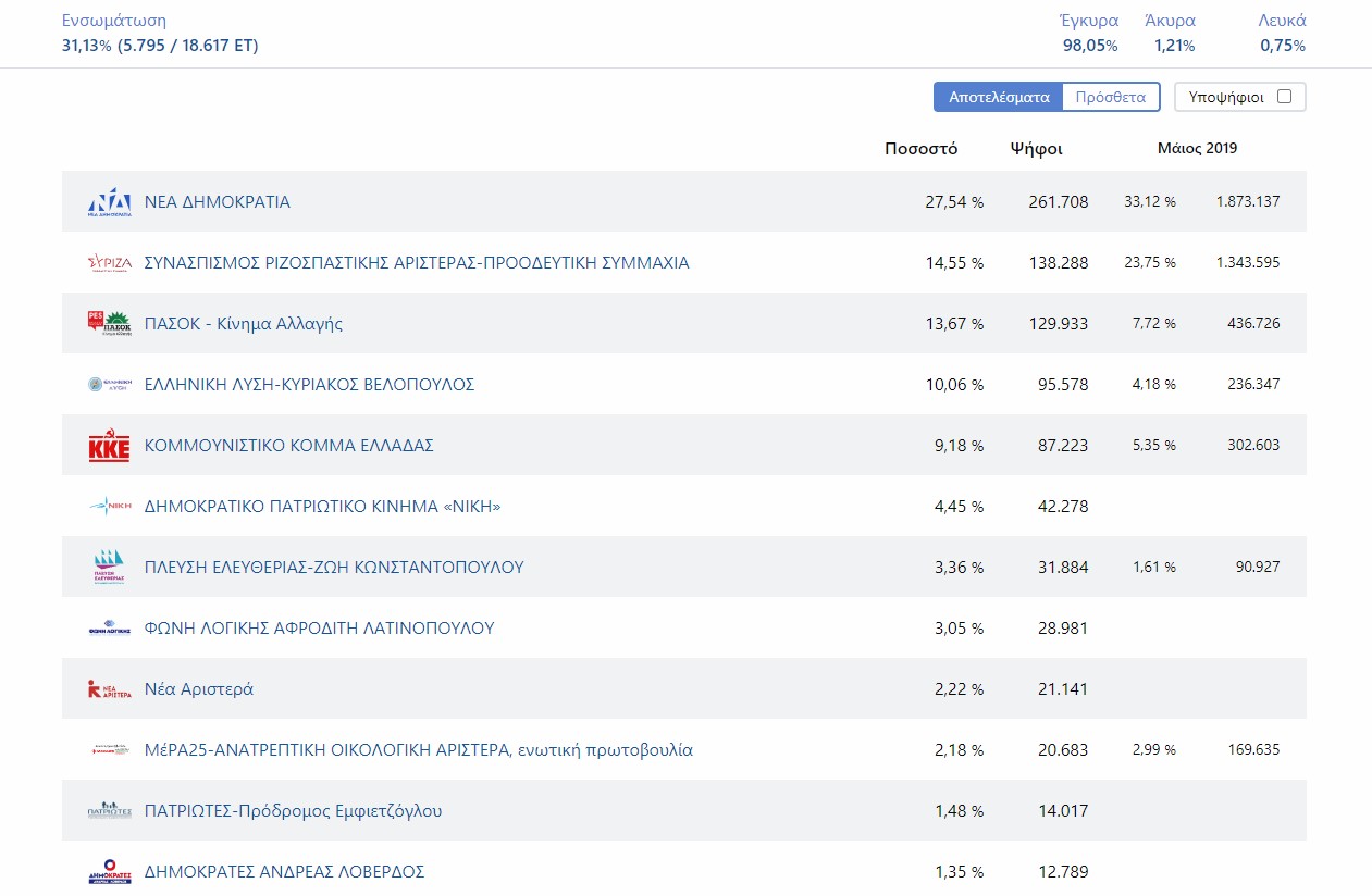 08:03 Τα τελικά αποτελέσματα των ευρωεκλογών της 9ης Ιουνίου, με βάση το 100% της ενσωμάτωσης των ψήφων, όπως αποτυπώθηκαν στον πίνακα της Singular Logic: