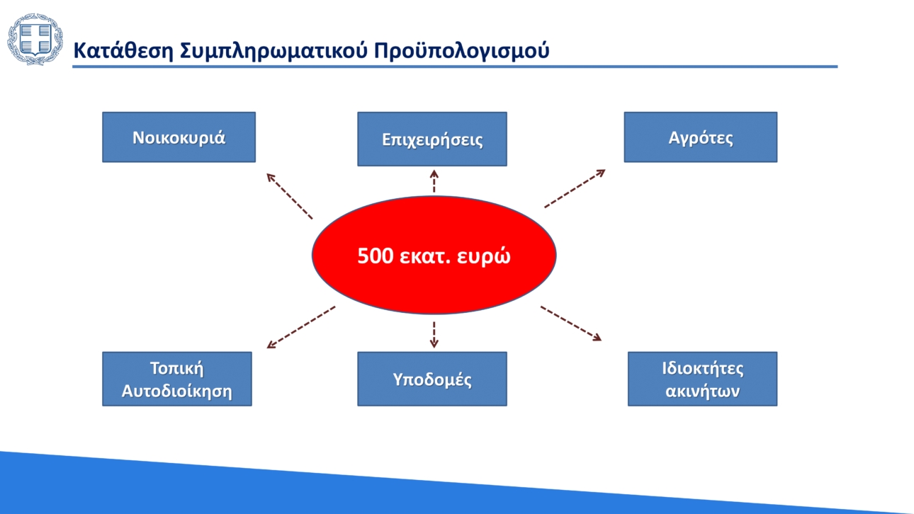 Για την υλοποίηση αυτών, με απόφαση του υπουργού Οικονομικών και του αναπληρωτή υπουργού Οικονομικών, σε συνεργασία με το υπουργείο Ανάπτυξης και Επενδύσεων, δρομολογείται η κατάθεση συμπληρωματικού προϋπολογισμού, ύψους 500 εκατ. ευρώ.