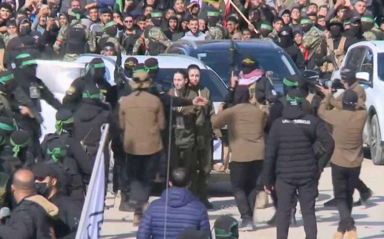 Νωρίτερα το Σάββατο, και προτού παραδοθούν στον Ερυθρό Σταυρό, ο οποίος μεσολαβεί στις περιπτώσεις ανταλλαγής ομήρων και παλαιστίνιων κρατουμένων, οι γυναίκες οδηγήθηκαν σε μία εξέδρα στην Πόλη της Γάζας εν μέσω ενός πλήθους Παλαιστινίων και περικυκλωμένες από δεκάδες ένοπλους της τρομοκρατικής οργάνωσης που ασκεί την εξουσία στον θύλακα.