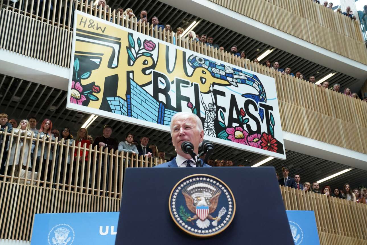 Ο Μπάιντεν κάλεσε τις πολιτικές δυνάμεις της Βόρειας Ιρλανδίας να ξεπεράσουν αυτά που τους χωρίζουν για να τερματίσουν την παράλυση των πολιτικών θεσμών, την λειτουργία των οποίων μποϊκοτάρει το Δημοκρατικό Ενωτικό Κόμμα (DUP) εξαιτίας των συνεπειών του Brexit, κατά την ομιλία του στο πανεπιστήμιο του Μπέλφαστ.