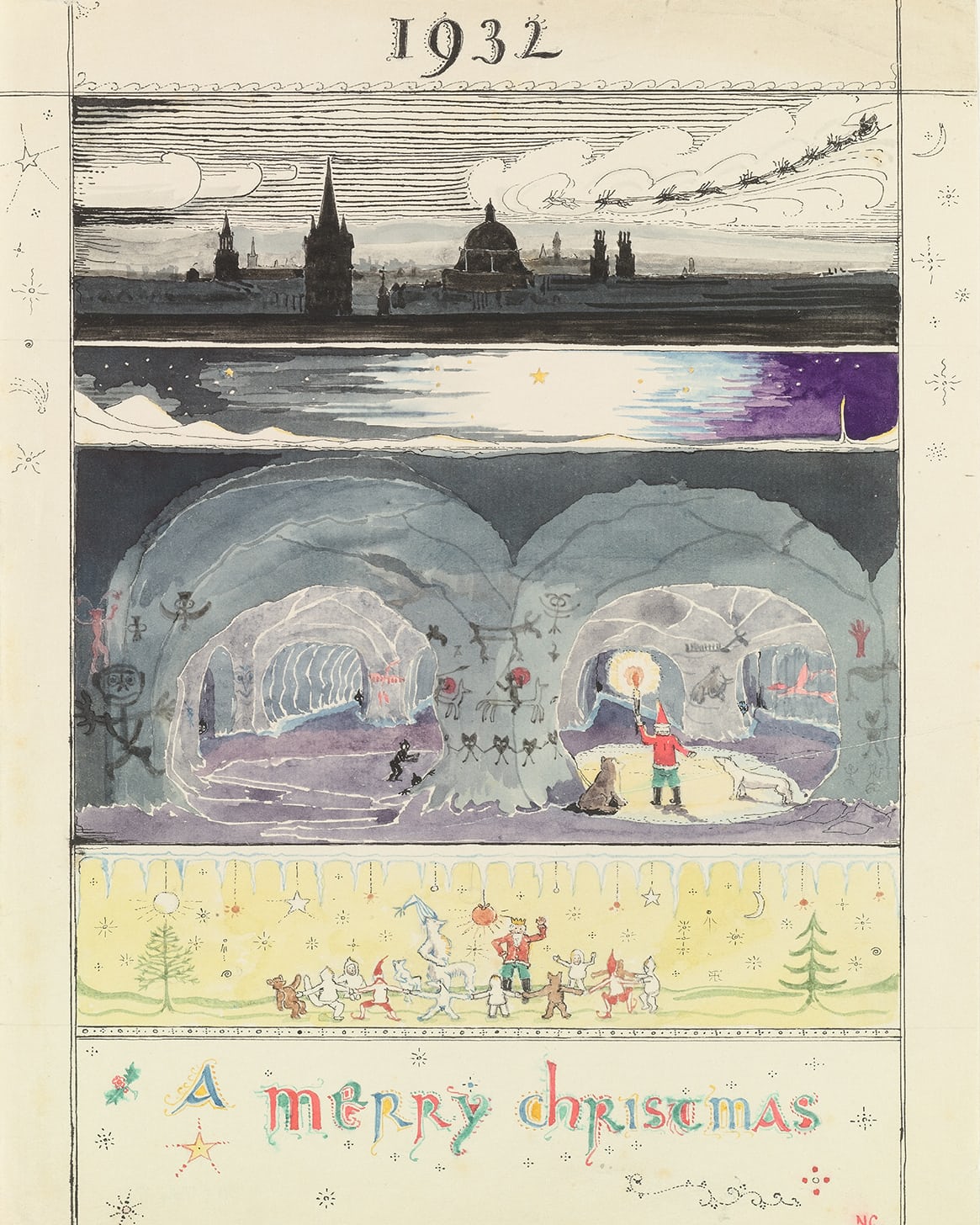 Κάποιες χρονιές, ο «Πατέρας των Χριστουγέννων» ήταν πολύ απασχολημένος και το μόνο που προλάβαινε να κάνει ήταν να στέλνει μερικά σύντομα νέα, άλλες φορές όμως, όταν είχε χρόνο ζωγράφιζε περίτεχνα έργα. Ένα από αυτά δείχνει τον τάρανδό του την ώρα που φτάνει με το έλκηθρο στον ορίζοντα της Οξφόρδης: «το σπίτι σας είναι δεξιά ακριβώς εκεί που ξεπροβάλλουν από τη σκιά τρία μικρά μαύρα σημεία».