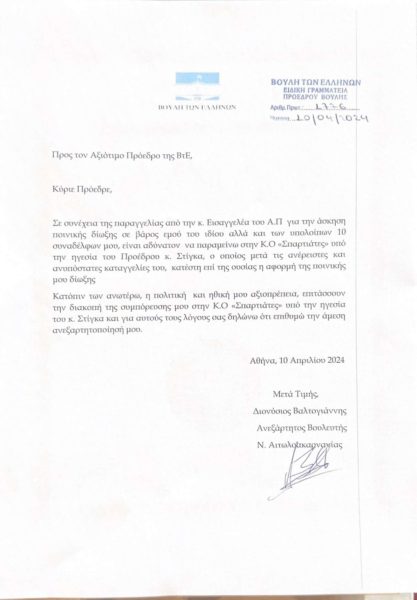 «Η πολιτική και ηθική μου αξιοπρέπεια, επιτάχυναν τη διακοπή τής συμπόρευσης μου στην Κ.Ο ”Σπαρτιάτες»” υπό την ηγεσία του κ. Στίγκα και για αυτούς τους λόγους δηλώνω την άμεση ανεξαρτητοποίηση μου», καταλήγει στην επιστολή που ο κ. Βαλτογιάννης.