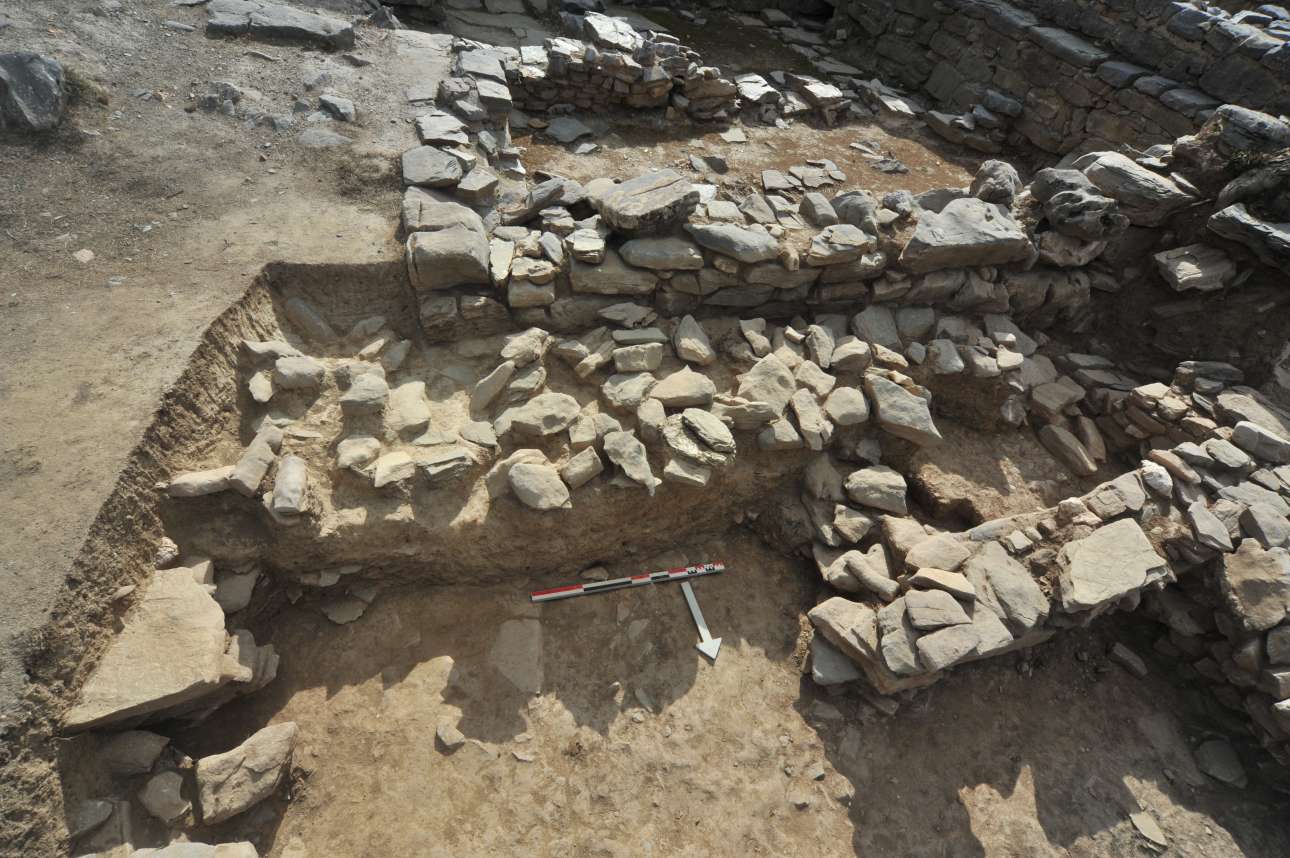 Στο επίπεδο της ΥΜ ΙΑ περιόδου (περί το 1650 π.Χ.) αποκαλύφθηκαν τρία λίθινα ανοίγματα (αγωγοί αποστράγγισης) (φωτογραφία 3) των χώρων του Κεντρικού Κτηρίου και των δυτικών διαμερισμάτων που προσκολλήθηκαν σε αυτό αμέσως μετά την καταστροφή του, περί το 1650 π.Χ. (Συγκρότημα I).