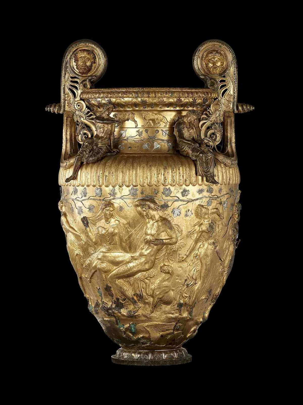 Εικόνα 1: Ο μπρούτζινος Κρατήρας του Δερβενίου. Κεντρικές μορφές της ανάγλυφης παράστασης στο σώμα του αγγείου είναι ο Διόνυσος και η Αριάδνη σε σκηνή ιερού γάμου. 330-320 π.Χ. (Αρχαιολογικό Μουσείο Θεσσαλονίκης)