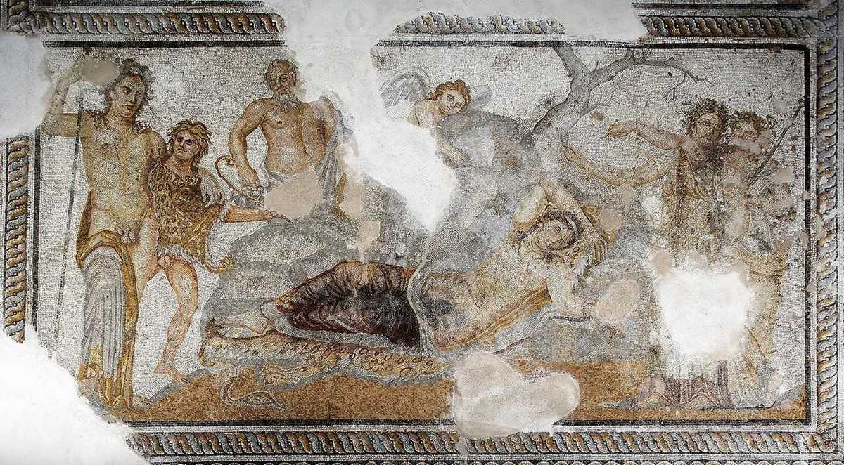 Εικόνα 2: Πολυπρόσωπη διονυσιακή σκηνή σε ψηφιδωτό δάπεδο από πολυτελή οικία της Θεσσαλονίκης. Εικονίζεται η άφιξη του Διονύσου στη Νάξο, όπου συναντά την κοιμισμένη Αριάδνη. 200-250 μ.Χ. (Αρχαιολογικό Μουσείο Θεσσαλονίκης)