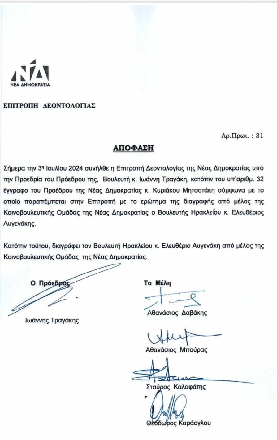 Το μεσημέρι της Τετάρτης, ο Κυριάκος Μητσοτάκης αποφάσισε τη διαγραφή του βουλευτή Ηρακλείου από την ΚΟ του ΝΔ, στη σκιά του επεισοδίου στο αεροδρόμιο «Ελ. Βενιζέλος» και της επίθεσης κατά εργαζομένου στο οποίο πρωταγωνίστησε ο κ. Αυγενάκης.