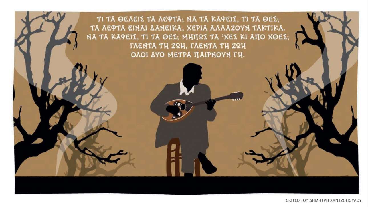 Ο Δημήτρης Χαντζόπουλος για την «Καθημερινή» της Παρασκευής εμφάνισε τον Πρωθυπουργό της χώρας ως ρεμπέτη που ερμηνεύει το περίφημο τραγούδι του θρυλικού Γιάννη Παπαϊωάννου «Γλέντα τη ζωή (Τι τα θέλεις τα λεφτά;)»