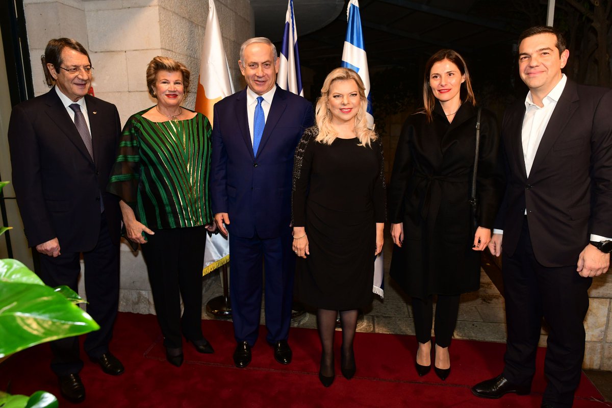 WATCH: Prime Minister Netanyahu and his wife Sara host dinner for Greek Prime Minister Tsipras and his partner Peristera "Betty" Baziana and Cypriot President Anastasiades and his wife Andri Moustakoudi, at the Prime Minister's Residence in Jerusalem. pic.twitter.com/CQtFFHlRpH