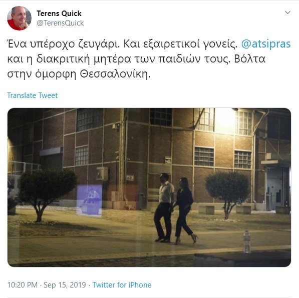 Ο πολυταξιδευμένος πρώην υφυπουργός Εξωτερικών και πρώην ηγετικό στέλεχος των Ανεξ. Ελλήνων (ό,τι και αν σημαίνει αυτό πια), εντόπισε τον κ. Τσίπρα και τη σύντροφό του Μπέτυ Μπαζιάνα να κάνουν βόλτα πιασμένοι χέρι χέρι στη νυχτερινή Θεσσαλονίκη και ανήρτησε τη φωτογραφία στο Twitter, αποθεώνοντας το ζευγάρι.