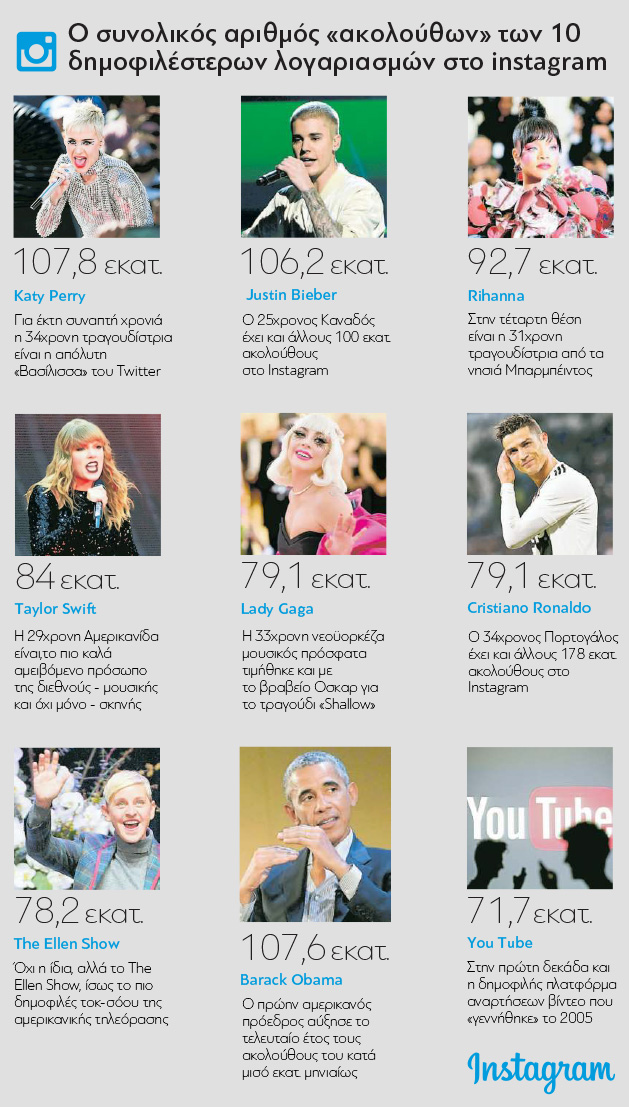 Στην τέταρτη θέση είναι η τραγουδίστρια Ριάνα με 92.7 εκατ. ακολούθους, κατόπιν η Τέιλορ Σουίφτ με 84 εκατ. ακολούθους και μετά η Λέιντι Γκάγκα με 79.1 εκατ. ακολούθους.