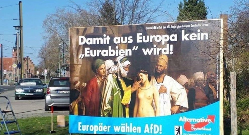 Ο πίνακας «Το σκλαβοπάζαρο» του γάλλου οριενταλιστή ζωγράφου Ζαν-Λεόν Ζερόμ εικονίζει τέσσερις γενειοφόρους άνδρες με τουρμπάνια να εξετάζουν τα δόντια μιας γυμνής σκλάβας. Κάτω από την εικόνα, προσέθεσε τα σλόγκαν: «Οι Ευρωπαίοι ψηφίζουν την AfD» και «Για να μην γίνει η Ευρώπη… Ευραβία» – ένα λογοπαίγνιο με τη λέξη Αραβία.