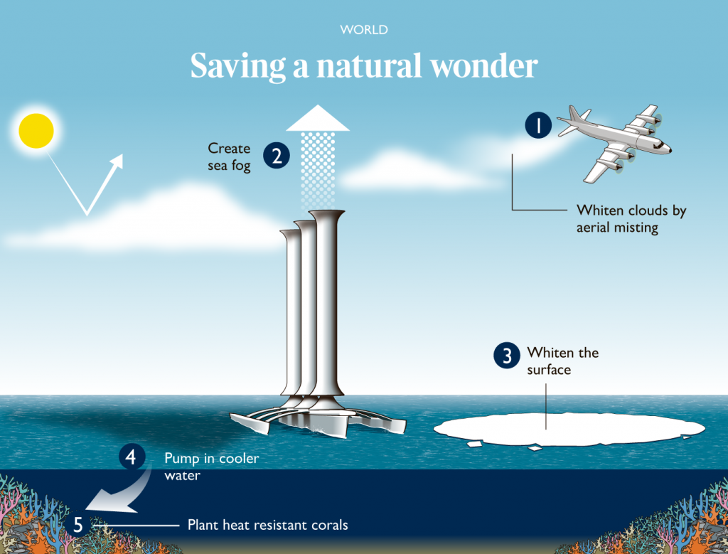 Όπως αναφέρουν σε δημοσίευμα τους οι Times μέχρι στιγμής έχουν παρουσιαστεί 43 ιδέες ορισμένες από τις οποίες έλαβαν έγκριση και χρηματοδότηση για να διαπιστωθεί κατά πόσο είναι υλοποιήσιμες. Ορισμένες από αυτές τις ιδέες ανήκουν στον τομέα της γεωμηχανικής. Μία από αυτές κάνει λόγο για τεχνητή λεύκανση των σύννεφων που βρίσκονται πάνω από τα κοράλλια. Ένα αεροσκάφος θα ψεκάζει τα νέφη με κρυστάλλους άλατος για να αυξηθεί η λεύκανση τους κάτι που θα τους επιτρέπει να αντανακλούν περισσότερη ηλιακή ακτινοβολία στο Διάστημα μειώνοντας έτσι το ποσοστό που θα έφτανε στην επιφάνεια της Γης θερμαίνοντας την.
