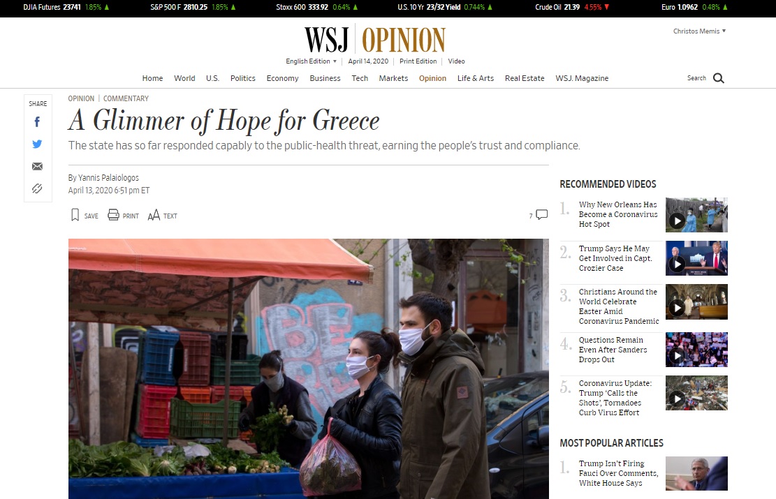 «Αχτίδα Ελπίδας από την Ελλάδα» είδε η Wall Street Journal (WSJ) και σε ανάλυσή της τονίζεται η πολύ αποτελεσματική διαχείριση και έγκαιρη αντιμετώπιση της πανδημίας από την κυβέρνηση Μητσοτάκη με ειδική αναφορά στην κινητοποίηση, το συντονισμό και την «απρόσμενη αποτελεσματικότητα της ελληνικής δημόσιας διοίκησης, τη σταθερή και αυξανόμενη ενίσχυση των κρίσιμων μονάδων στον τομέα της υγείας (ΜΕΘ), την αθόρυβη επανάσταση ψηφιοποίησης του κράτους».