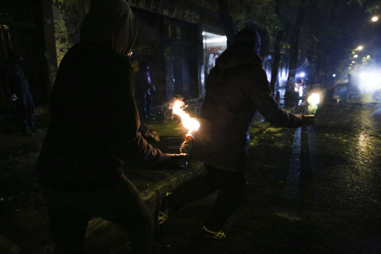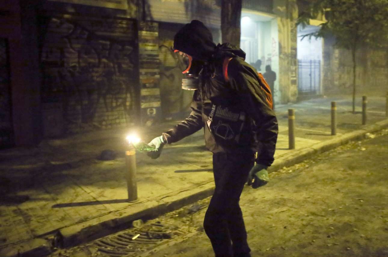 Κουκουλοφόροι έστησαν οδοφράγματα, έβαλαν φωτιές και έριξαν δεκάδες βόμβες μολότοφ, πέτρες, καδρόνια και διάφορα άλλα αντικείμενα κατά αστυνομικών δυνάμεων, που απάντησαν με χρήση δακρυγόνων και χειροβομβίδων κρότου – λάμψης.