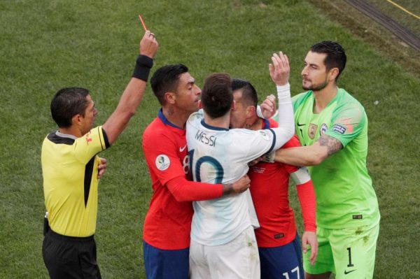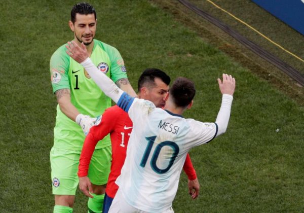 Βρισκόμαστε στο 37ο λεπτό του τελικού «της παρηγοριάς» στο Κόπα Αμέρικα. Ο γνωστός… συλλέκτης κόκκινων καρτών (μετράει, ήδη, έξι με την εθνική ομάδα της Χιλής), Γκάρι Μεντέλ, απωθεί τον Λιονέλ Μέσι με το σώμα του, βιαίως και κατ’ επανάληψη. Ο Αργεντινός κοντράρει τον αντίπαλο αρχηγό με το στήθος, αποκρούοντας τις επιθέσεις του. Αλλά ο παραγουανός διαιτητής της αναμέτρησης, Μάριο Ντίας, τους αποβάλλει και τους δύο.