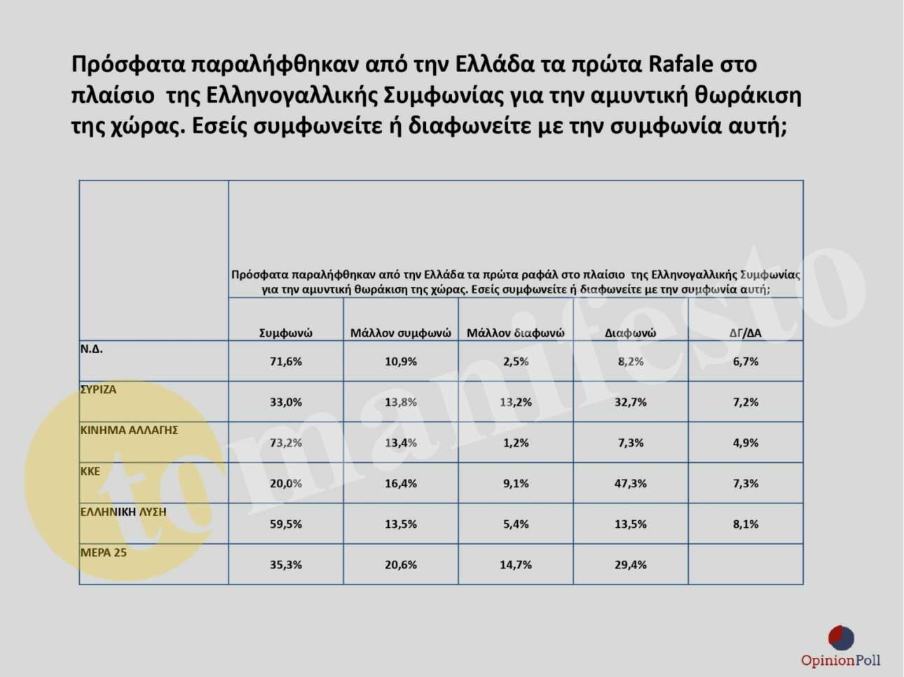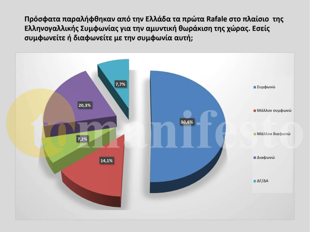 Kαι όλα αυτά με δεδομένη την ευρεία αποδοχή που φαίνεται ότι απολαμβάνει η προμήθεια των Rafale στο πλαίσιο της συμφωνίας αμυντικής συνεργασίας Ελλάδος – Γαλλίας από την κοινή γνώμη, με το 64% των ερωτηθέντων στην τελευταία δημοσκόπηση της Opinion Poll να τάσσεται υπέρ της συμφωνίας.