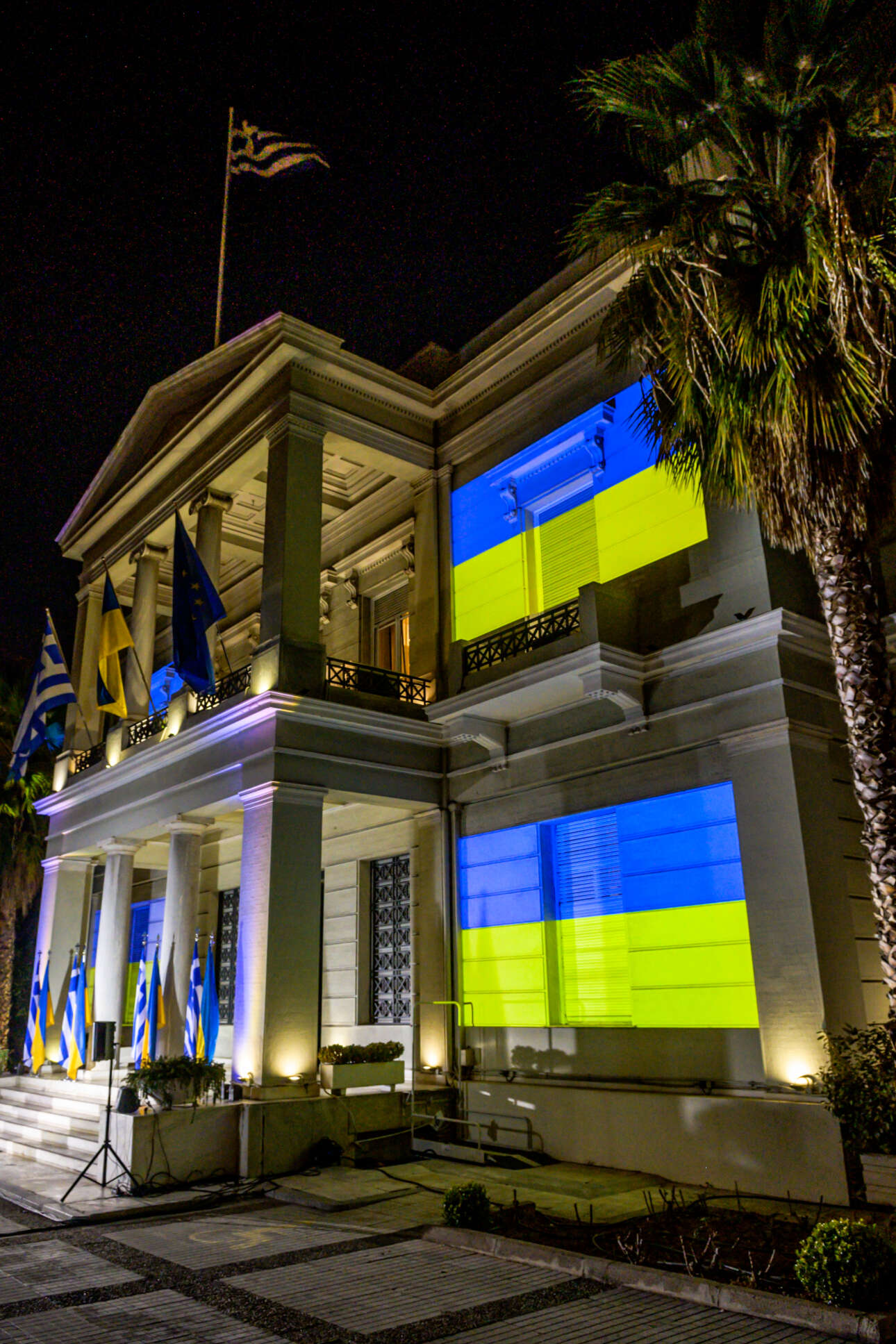 Με φόντο το φωταγωγημένο κτίριο και πλαισιωμένος από τα αριστερά του με τον πρεσβευτή της Ουκρανίας στην Ελλάδα Σεργκέι Σουτένκο και από τα δεξιά του επικεφαλής διπλωματικών αντιπροσωπειών στην Ελλάδα, όπως των πρεσβευτών της Γερμανίας και της Μεγάλης Βρετανίας, ο υπουργός Εξωτερικών Νίκος Δένδιας έστειλε μήνυμα αλληλεγγύης στον ουκρανικό λαό, υπογραμμίζοντας πως η Ελλάδα από την πρώτη μέρα στέκεται δίπλα στην Ουκρανία και ότι ο πόλεμος πρέπει να σταματήσει πριν χαθούν περισσότερες ζωές.