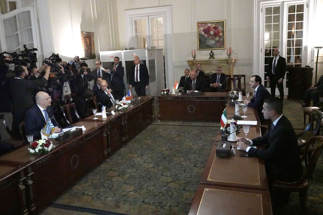 Με σκληρή γλώσσα, σε κοινό τους ανακοινωθέν, οι υπουργοί Εξωτερικών της Ελλάδας, της Κύπρου, της Αιγύπτου και της Γαλλίας, με τη συμβουλευτική συμμετοχή και της Ιταλίας, καταδίκασαν τις τουρκικές προκλήσεις στη Λιβύη αλλά και την Κύπρο. Σε συνεδρίασή τους στο Κάιρο, οι υπουργοί έκριναν ότι η υπογραφή των μνημονίων συμφωνίας τον Νοέμβριο, μεταξύ της Τουρκίας και του επικεφαλής της ΚΕΕ της Λιβύης Φαγιέζ αλ Σάραζ, συνιστά παραβίαση ψηφισμάτων του Συμβουλίου Ασφαλείας των Ηνωμένων Εθνών και του διεθνούς δικαίου, που υπονόμευσε περαιτέρω την περιφερειακή σταθερότητα – χαρακτηρίζοντας παράλληλα τα μνημόνια, κενά περιεχομένου και άκυρα. Παράλληλα, συμφώνησαν στο γεγονός ότι το μνημόνιο συμφωνίας Τουρκίας-Λιβύης παραβιάζει τα κυριαρχικά δικαιώματα τρίτων κρατών, δεν συμμορφώνεται με το Δίκαιο της Θάλασσας και δεν μπορεί να παράγει νομικές συνέπειες.