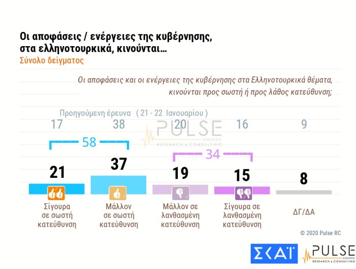 Στα Ελληνοτουρκικά, το 58% υποστηρίζει την κυβερνητική στάση (το 21% λέει σίγουρα προς την σωστή κατεύθυνση, το 37% μάλλον προς τη σωστή κατεύθυνση) και το 34% την απορρίπτει (19% μάλλον σε λάθος κατεύθυνση, το 15% σίγουρα σε λάθος κατεύθυνση).
