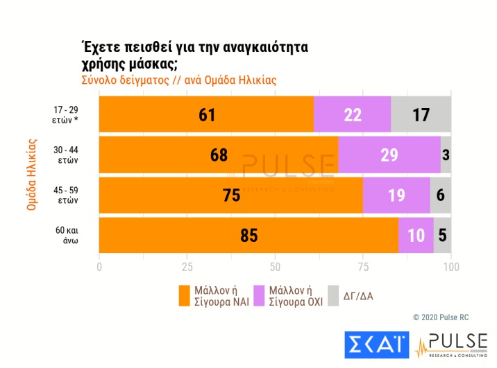 Οσο μεγαλύτερος είναι ο ερωτώμενος, τόσο περισσότερο πεπεισμένος φαίνεται για τη χρήση της μάσκας. Στην ομάδα 17-29 ετών λέει «ναι» το 61%, στους 30-44 το 68%, στους 45-59 το 75% και στους άνω των 65 το 85%.