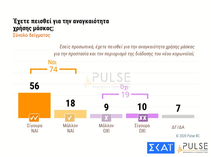 Το 74% των ερωτηθέντων δήλωσε ότι έχει πειστεί για την αναγκαιότητα της μάσκας (56% σίγουρα ναι, 18% μάλλον ναι).