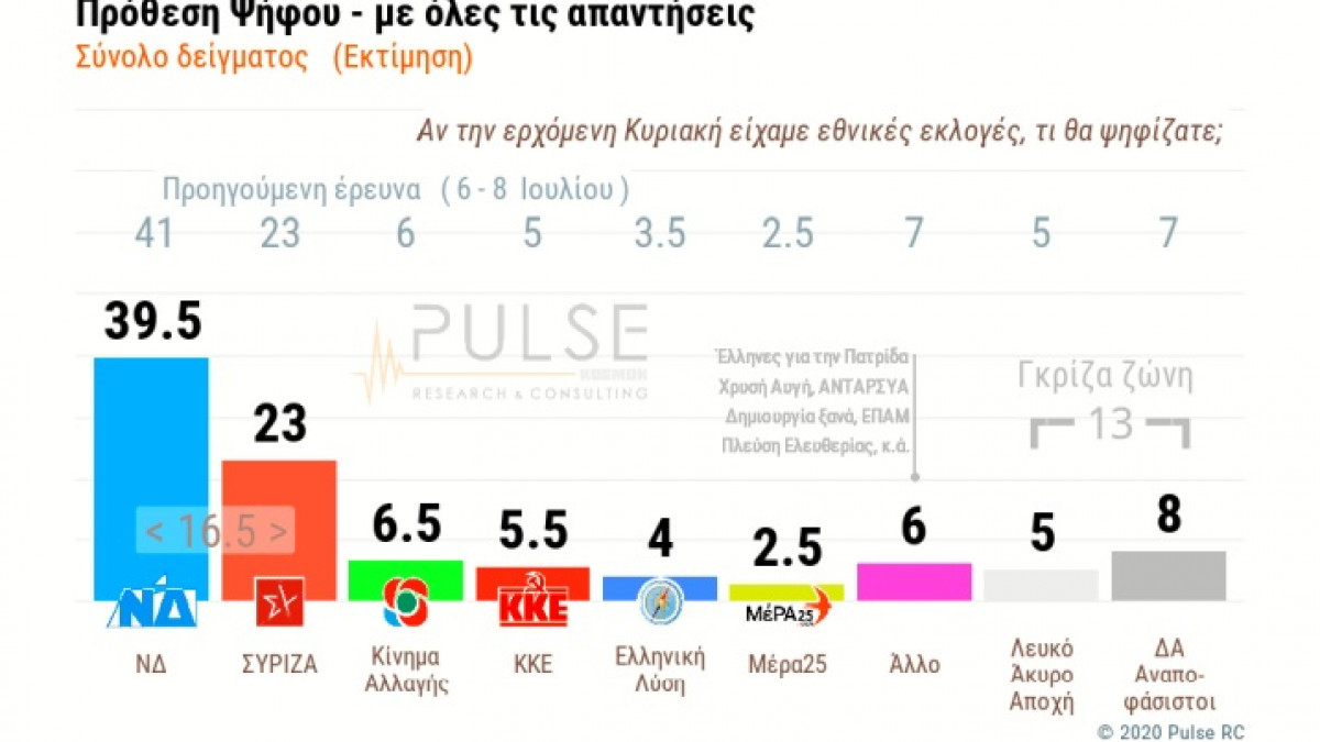 Στην έρευνα της Pulse για λογαριασμό του ΣΚΑΪ, η οποία παρουσιάστηκε την Πέμπτη, το κυβερνών κόμμα προηγείται με 16,5 μονάδες του ΣΥΡΙΖΑ στην πρόθεση ψήφου. Σε σχέση με τον Ιούλιο και την έρευνα της ίδιας εταιρείας, η ΝΔ σημειώνει πτώση κατά 2%, αλλά ο ΣΥΡΙΖΑ παραμένει στάσιμος, κάτι που πρέπει να προβληματίσει την ηγεσία του, η οποία με την πολιτική που έχει υιοθετήσει δεν φαίνεται να κερδίζει από τη φθορά του κυβερνώντος κόμματος.