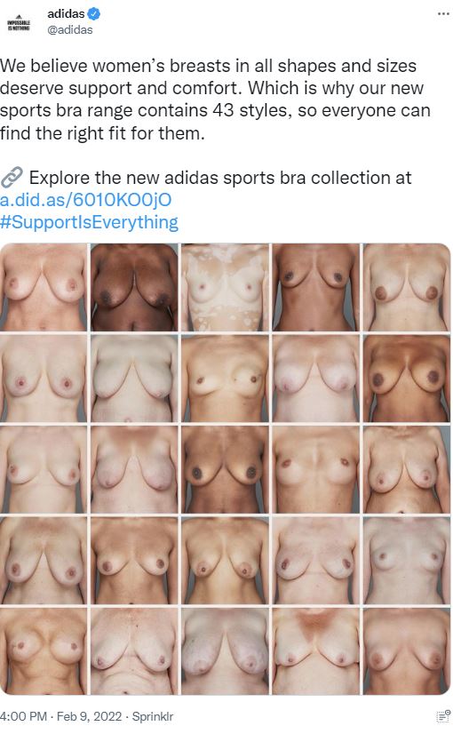 «Κόκκινο φως» στη διαφημιστική καμπάνια της Adidas η οποία θέλησε να αναδείξει την ποικιλομορφία του στήθους των γυναικών σε αφίσες και αναρτήσεις στα social media, προκειμένου να προωθήσει την ποικιλία των αθλητικών σουτιέν της, «άναψε» ο βρετανικός οργανισμός που εποπτεύει τη δεοντολογία στον διαφημιστικό κλάδο του Ηνωμένου Βασιλείου, λόγω άσεμνου γυμνού και κινδύνου έκθεσης του περιεχομένου της εκστρατείας σε μέρη όπου θα μπορούσαν να το δουν ανήλικοι.