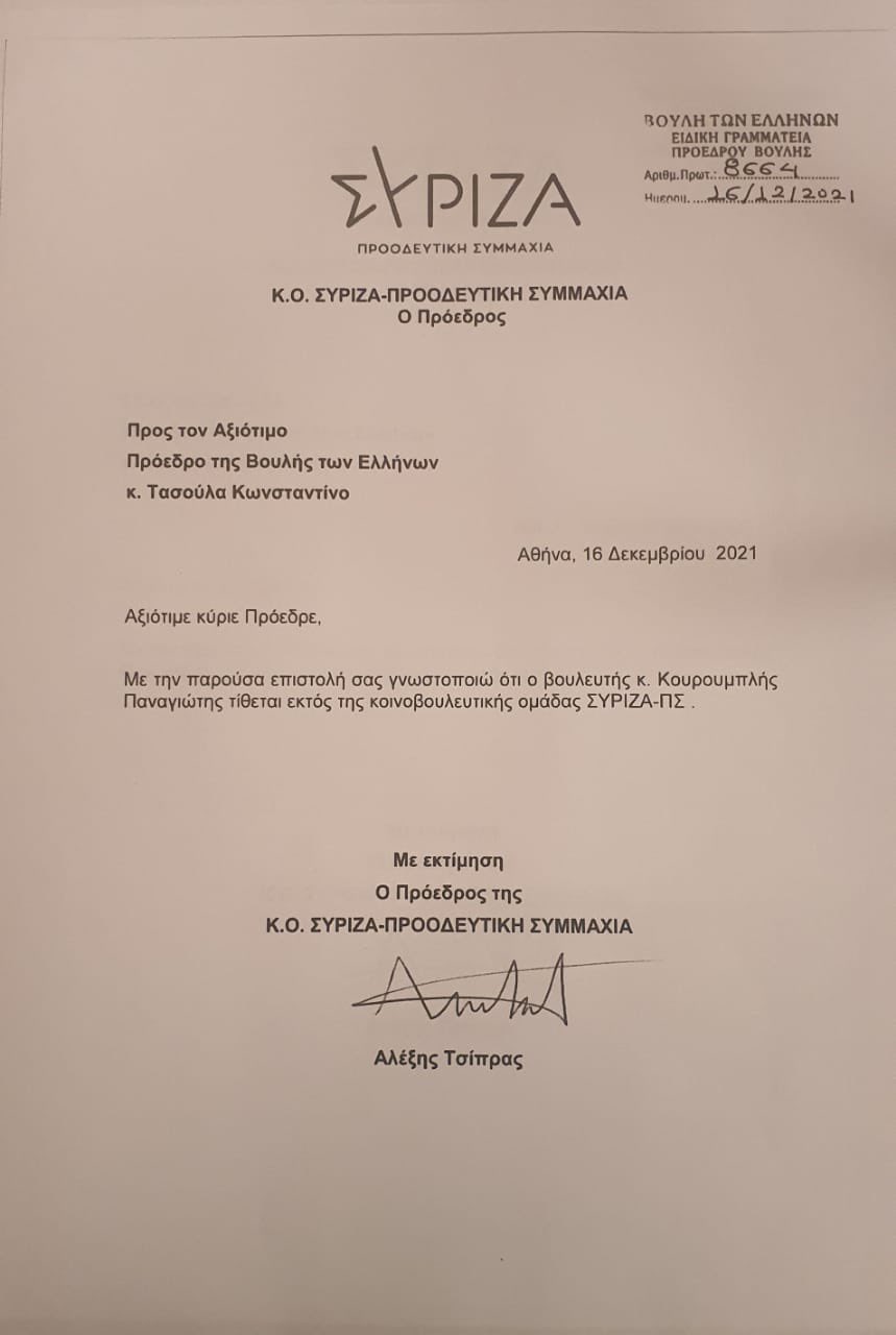 Ο κ. Τσίπρας ήταν στις Βρυξέλλες ως παρατηρητής της συνόδου των Ευρωπαίων Σοσιαλιστών. Αφού επικοινώνησε με τη γραμματέα της ΚΟ Ολγα Γεροβασίλη απέστειλε επιστολή του προς τον Πρόεδρο της Βουλής, στην οποία ανέφερε: «Με την παρούσα επιστολή σας γνωστοποιώ ότι ο βουλευτής κ. Κουρουμπλής Παναγιώτης τίθεται εκτός της κοινοβουλευτικής ομάδας ΣΥΡΙΖΑ-ΠΣ».