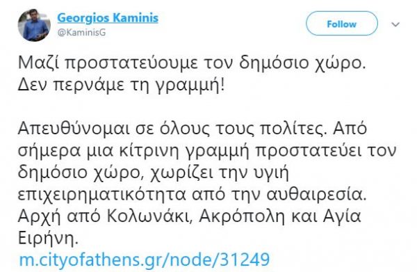 Με μια κίτρινη γραμμή επιχειρεί ο δήμαρχος Αθηναίων, Γιώργος Καμίνης, να αντιμετωπίσει την αυθαιρεσία πολλών επιχειρήσεων, που καταλαμβάνουν δημόσιο χώρο, τοποθετώντας τραπεζοκαθίσματα.