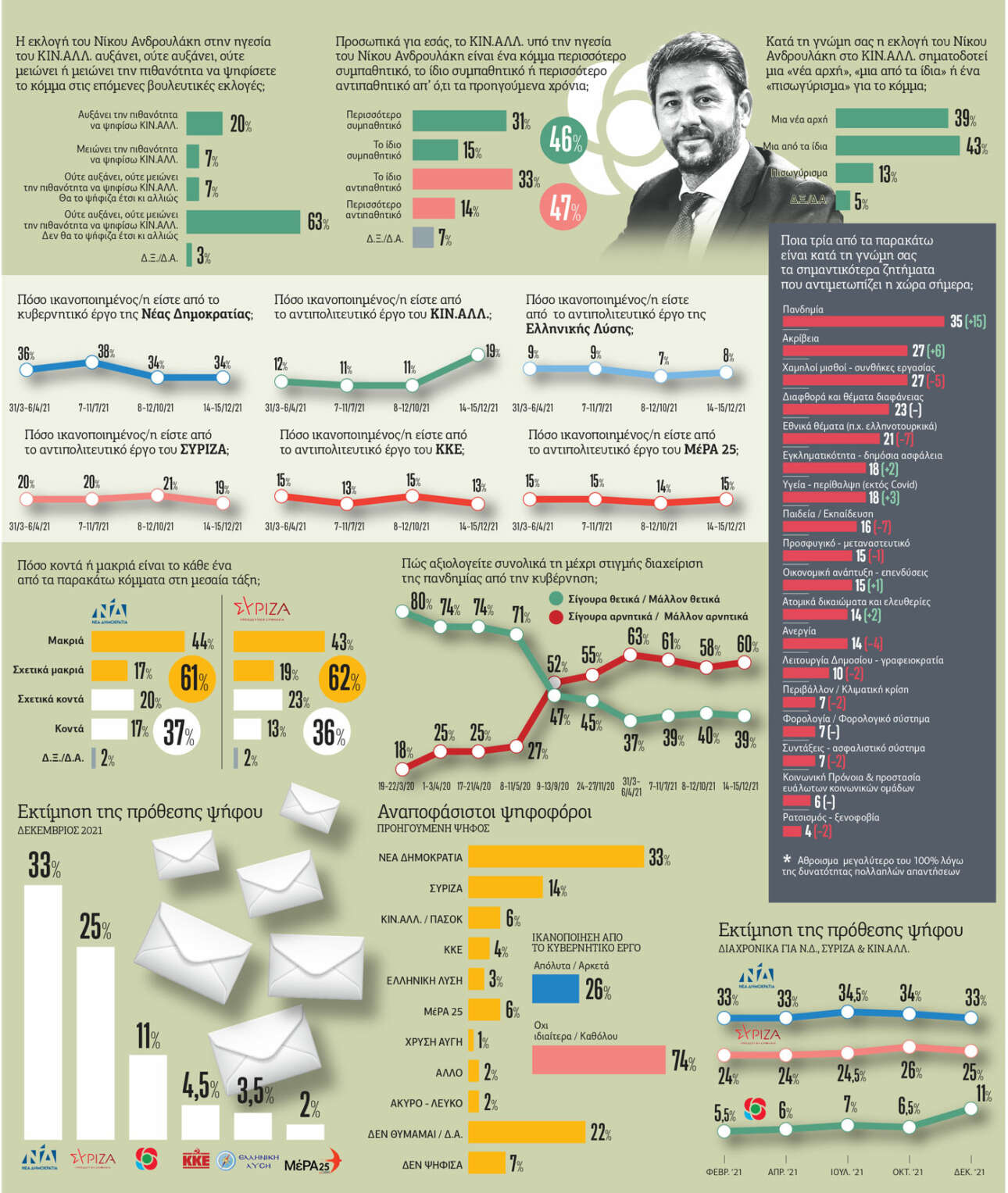 Προς το παρόν βέβαια, ΝΔ και ΣΥΡΙΖΑ παραμένουν κυρίαρχες δυνάμεις, με τη διαφορά τους να παραμένει στις οκτώ ποσοστιαίες μονάδες (η ΝΔ μετρήθηκε στο 33% και ο ΣΥΡΙΖΑ στο 25%). Ομως είναι χαρακτηριστικό ότι και τα δύο κόμματα καταγράφουν απώλειες (από 1%) σε σύγκριση με την αντίστοιχη μέτρηση του Οκτωβρίου, ενώ το ΚΙΝΑΛ μετρήθηκε στο 11% από το 6,5%!