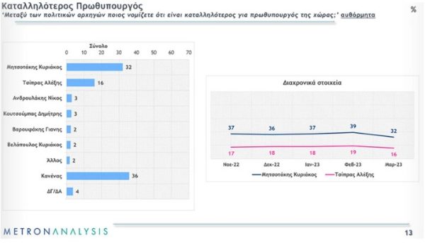 Ο Κυριάκος Μητσοτάκης παραμένει σταθερά πρώτος στο ερώτημα για τον καταλληλότερο Πρωθυπουργό, αν και με 35 μονάδες έναντι 38 στην προηγούμενη μέτρηση της ίδιας εταιρείας. Το ποσοστό του Αλέξη Τσίπρα παραμένει αμετάβλητο, στο 27%, όπως και τα ποσοστά του ΣΥΡΙΖΑ στην πρόθεση ψήφου.