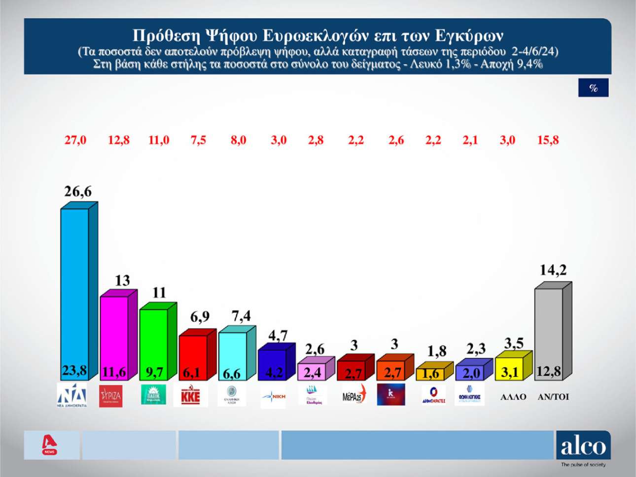 Ισχυρό προβάδισμα της Νέας Δημοκρατίας ενόψει των ευρωεκλογών της 9ης Ιουνίου κατέγραψε η νέα δημοσκόπηση της Alco για λογαριασμό του Alpha, η οποία δόθηκε στη δημοσιότητα την Τετάρτη, λίγες ημέρες προτού ανοίξουν οι κάλπες.