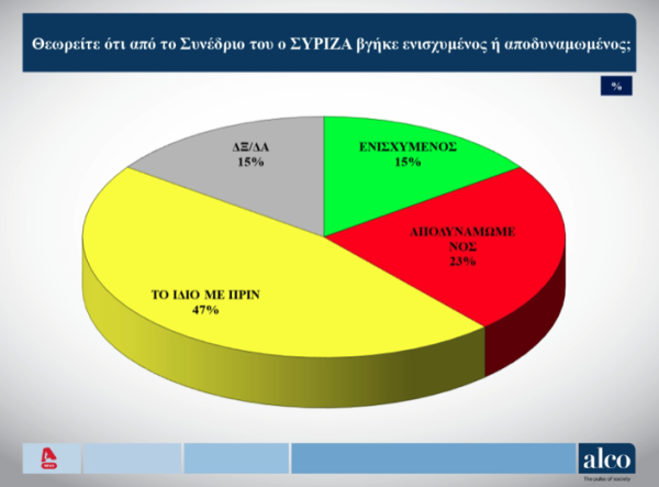 Αναφορικά με τον αντίκτυπο που είχε στον ΣΥΡΙΖΑ το πρόσφατο συνέδριο του κόμματος, σχεδόν οι μισοί από τους ερωτηθέντες (47%) έκριναν πως η Κουμουνδούρου… έμεινε ίδια. Για το 29%, ωστόσο, ο ΣΥΡΙΖΑ αποδυναμώθηκε.