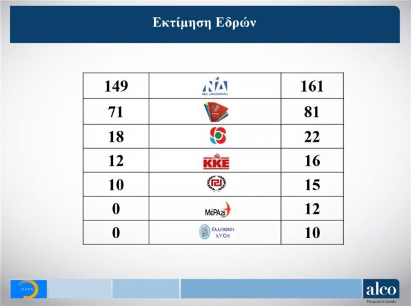 Αναφορικά με την εκτίμηση για την κατανομή των εδρών, η Νέα Δημοκρατία υπολογίζεται ότι θα αριθμεί από 149 έως 161 στη νέα Βουλή, ο ΣΥΡΙΖΑ θα κινηθεί μεταξύ 71 και 81, το Κίνημα Αλλαγής από 18 έως 22, το ΚΚΕ από 12 έως 16, η ΧΑ από 10 έως 15, το Μέρα 25 από 0 έως 12 και η Ελληνική Λύση από 0 έως 10.