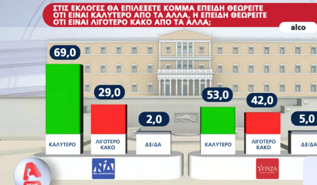 Στο ερώτημα «θα επιλέξετε κόμμα επειδή θεωρείτε ότι είναι καλύτερο από τα άλλα ή λιγότερο κακό», το 51% λέει πως ψηφίζει το κόμμα που πιστύει ότι είναι «ο καλύτερο», ωστόσο το 43% δηλώνει πως ψηφίζει με κριτήριο «το λιγότερο κακό».
