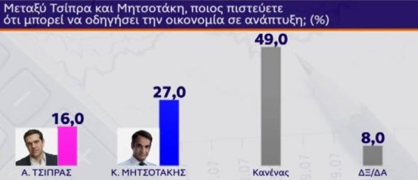 Ως προς το ποιον εμπιστεύονται περισσότερο ως πρωθυπουργό, το 25% απαντά «Τσίπρας», το 27% απαντά «Μητσοτάκης» και το 42% «Κανένας».