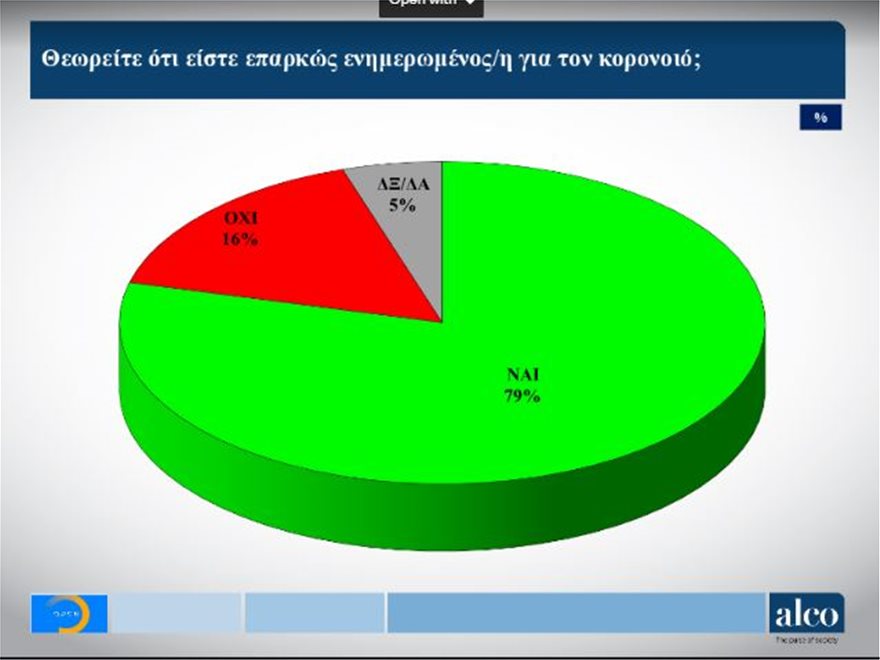 Σε ότι αφορά στον κορoνοϊό, το 79% δηλώνει επαρκώς ενημερωμένο.