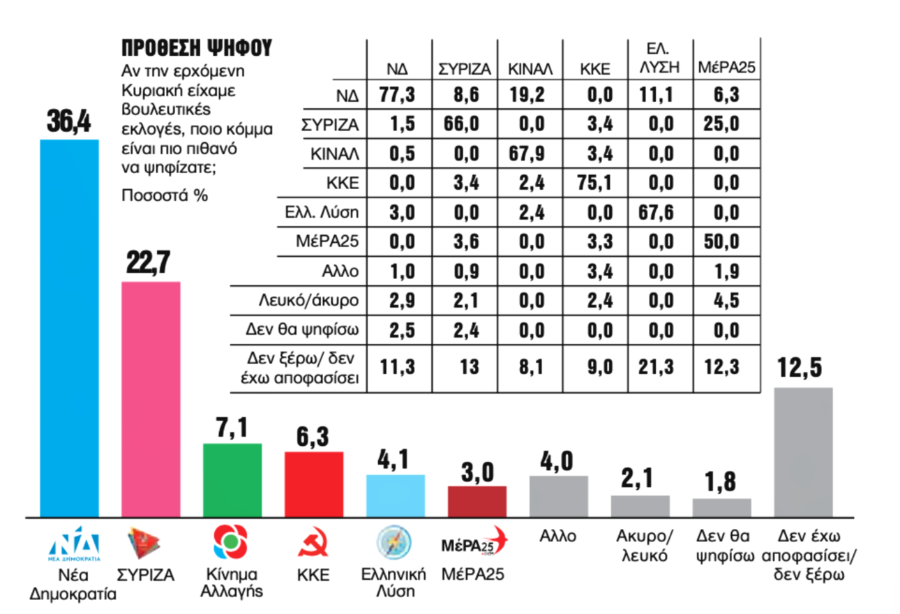 Η διαφορά μεταξύ ΝΔ και ΣΥΡΙΖΑ στη μεγάλη πανελλαδική δημοσκόπηση της GPO είναι στο 13,7%: ΝΔ 36,4%, ΣΥΡΙΖΑ 22,7%, Κίνημα Αλλαγής 7,1%, ΚΚΕ 6,3%, Ελληνική Λύση 4,1%, ΜέΡΑ25 3%. Αυτό σημαίνει ότι η ΝΔ συνεχίζει να βρίσκεται κοντά στην εκλογική επιρροή που είχε το 2019, ενώ ο ΣΥΡΙΖΑ είναι πολύ μακριά.