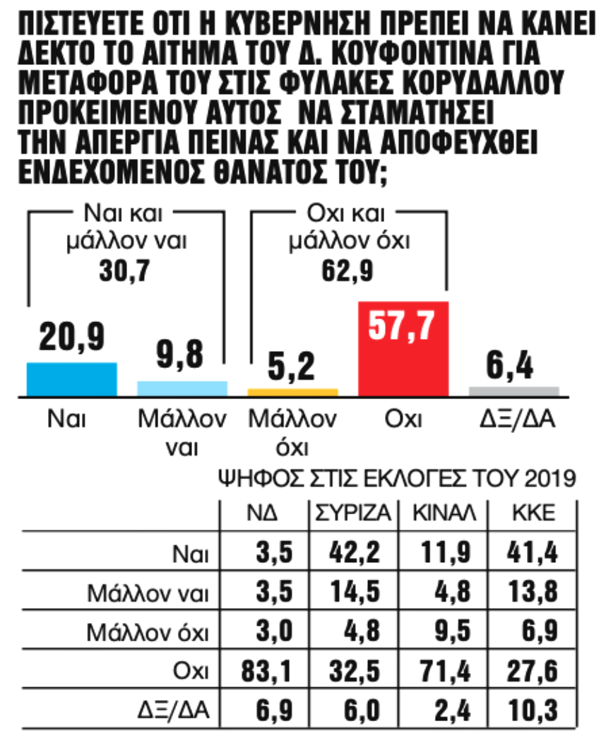 Το δεύτερο είναι η υπόθεση της απεργίας πείνας του αρχιεκτελεστή της 17Ν Δημήτρη Κουφοντίνα. Φαίνεται ότι η πολιτική στοίχιση του ΣΥΡΙΖΑ, η οποία εκφράστηκε δια στόματος του προέδρου του το περασμένο Σάββατο, πίσω από το αίτημα του τρομοκράτη όχι μόνο βρίσκει απέναντι μια ευρεία κοινωνική πλειοψηφία, αλλά προκαλεί αποσυσπείρωση και στο κομματικό ακροατήριο: Η κοινή γνώμη —σε ποσοστό 62,9%, ελαφρά λιγότερο από αυτό της μέτρησης της MRB— καλεί την κυβέρνηση να μην υποκύψει στον εκβιασμό της μεταγωγής, ενώ το μήνυμα αυτό εκπέμπει και το 37,3% των ψηφοφόρων του ΣΥΡΙΖΑ!