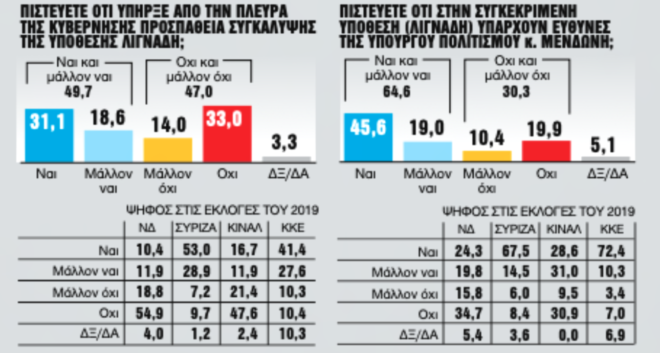 Το πρώτο είναι η υπόθεση του προφυλακισμένου πλέον τέως καλλιτεχνικού διευθυντή του Εθνικού Θεάτρου Δημήτρη Λιγνάδη. Ως προς αυτό η ΝΔ έχει δεχθεί πολιτικά ένα πλήγμα καθώς σχηματοποιείται μια πλειοψηφία, έστω και οριακή, η οποία θεωρεί ότι η κυβέρνηση κινήθηκε με στόχο να συγκαλύψει.