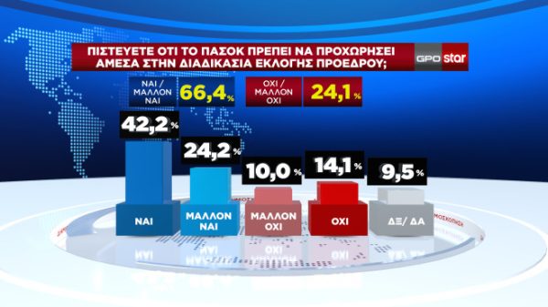 Σε ό,τι αφορά τις εξελίξεις στο ΠΑΣΟΚ, του οποίου η ηγεσία έχει τεθεί σε αμφισβήτηση λόγω του αποτελέσματος της ευρωκάλπης, οι πολίτες απάντησαν θετικά στην πλειοψηφία τους, και συγκεκριμένα σε ποσοστό 66,4% («ναι» και «μάλλον ναι»), στο ερώτημα εάν πιστεύουν ότι η Χαρ. Τρικούπη πρέπει να προχωρήσει άμεσα στη διαδικασία εκλογής νέου προέδρου.